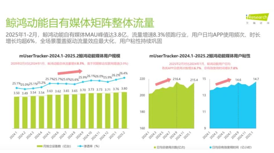 首先,从用户规模和活跃度来看,鲸鸿动能平台拥有庞大且高粘性的用户基础。艾瑞咨询数据显示:截至2025年初,其自有媒体矩阵的月活跃用户(MAU)峰值已突破3.8亿,流量增速达到8.3%,远高于同期移动互联网整体增速3.0%。用户日均使用频次和总使用时长也提升超过6%,表明用户粘性在持续增强。大量高价值用户每天都在华为生态的各种应用中频繁互动,这为品牌提供了丰富的触达机会。