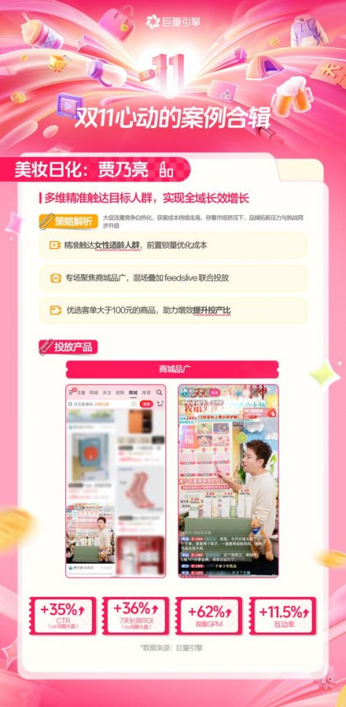 爆发力与转化力齐飞的明星营销样本。美力城借助TopView黄金15秒创新样式叠加明星总裁“双进播”玩法,不仅点击率显著高于行业均值,更实现直播生意环比增长286%,成功撬动大促声量与销量双峰值。