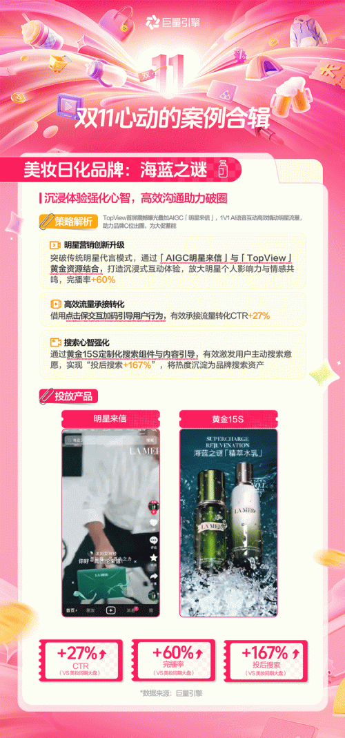 明星营销不止代言,更要共鸣。海蓝之谜将AIGC「明星来信」与TopView黄金资源融合,打造1V1语音互动体验,放大情绪连接与品牌心智。CTR+27%、搜索提升167%,创新内容让高端品牌对话更“触心”。