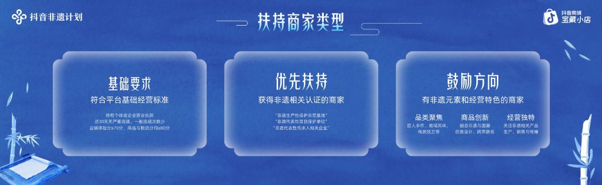 洞察到非遗中小商家常常面临用户信任建立不易、产品曝光渠道有限、启动阶段资源相对紧张等经营挑战,抖音电商「宝藏小店」计划针对性推出解决方案。该方案覆盖非遗商家成长全周期,面向符合基础经营标准的商家,尤其获得非遗相关认证、带有非遗元素或具备鲜明经营特色的商家。