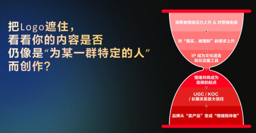 再看看当下的社交媒体环境,KOC(关键消费者)和UGC(用户原创内容)的影响力越来越大也证明了这一点。比如我自己最近穿了一件新羽绒服跟姐妹见面,她觉得很好也去下单了,这个时候,她甚至没有在意这个品牌或许她之前都没有穿过。这种普通人之间的分享往往比品牌自吹自擂更能打动消费者。同样的道理,我们判断自己的内容和情绪点是否真正触动了用户,可以做个小测试:遮住品牌Logo去看内容,问问自己这些内容是不是在为某个特定人群服务?如果摘掉Logo后内容依然对一群人有意义,那即使这个圈层很小众,也可能引发广泛共鸣,因为小众未必小意义。