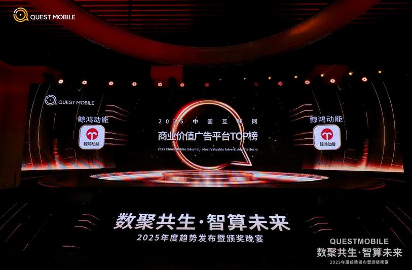 2026年1月30日,国内知名数据机构QuestMobile,在北京举办2025年度趋势发布暨颁奖晚宴,以“数聚共生,智算未来”为主题,聚焦AI时代下的产业变革。会上重磅揭晓了“中国移动互联网2025年价值榜”,共颁发二十项年度大奖。其中,鲸鸿动能荣获“2025中国互联网商业价值广告平台TOP榜”。