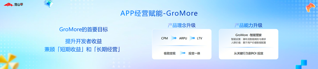 GroMore的升级,聚焦开发者的长期经营需求。GroMore的核心初衷便是为APP成长创造更多可能,不止于提升单一变现效率,更希望做大行业整体规模,让开发者高效回收投放成本,把好产品变成好生意,最终实现生态多方共赢。