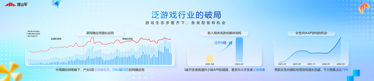 此次扶持成果显著,参与扶持的媒体CPM提升高达42%,消耗规模增长达209%;成功孵化6款变现破百万、DAU 超 50 万的网赚应用,树立行业标杆;另有3家开发者顺利跑通抖音小游戏转APP链路,实现流量。其中,女性向模拟经营游戏表现尤为突出,千川预算占比高达70%,成为中周期产品的增长亮点。