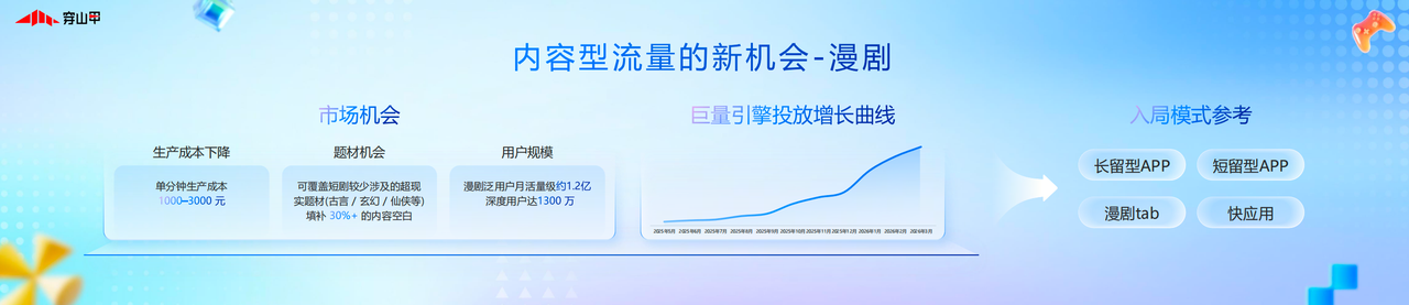 与此同时,穿山甲还指出内容型流量的新机会——漫剧。在泛用户月活约1.2亿的漫剧新赛道,其单分钟生产成本已降至 1000-3000 元,大幅降低了开发者的入局门槛,同时漫剧还可覆盖古言、玄幻、仙侠等短剧较少涉及的超现实题材,填补超 30% 的内容空白。