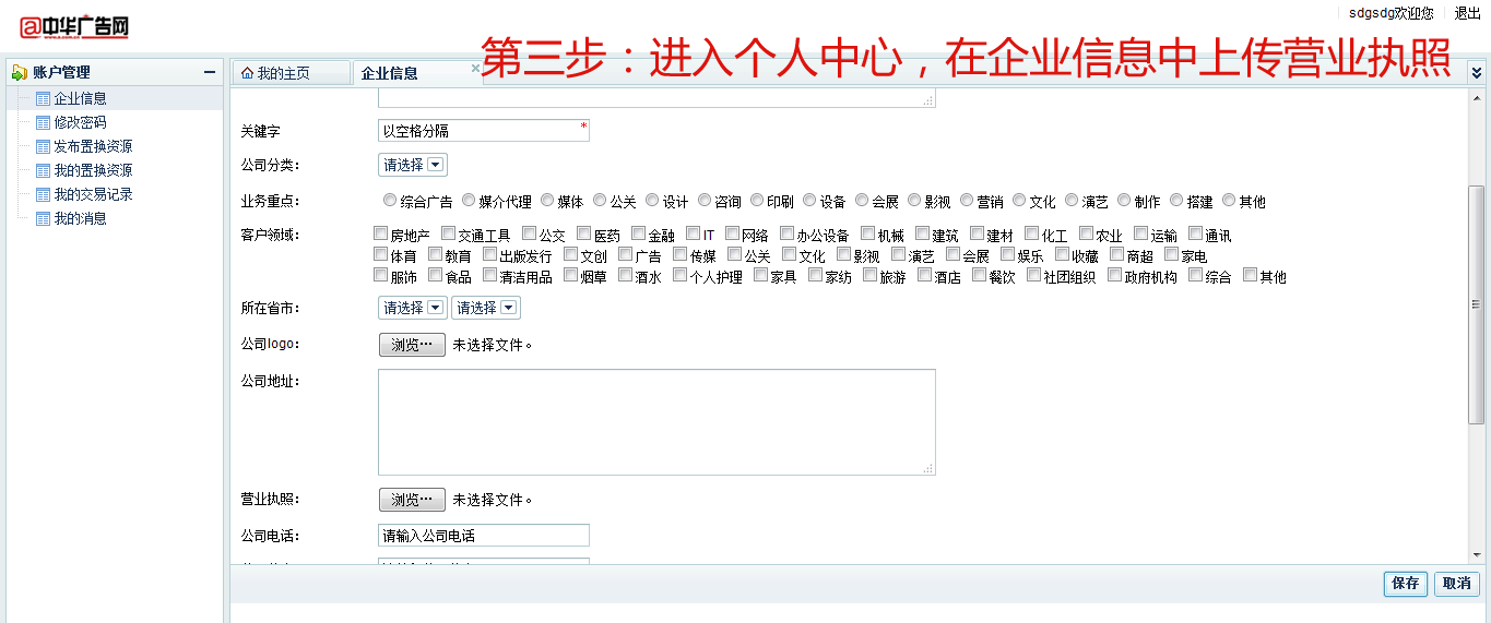 2、进入个人中心,完善企业信息